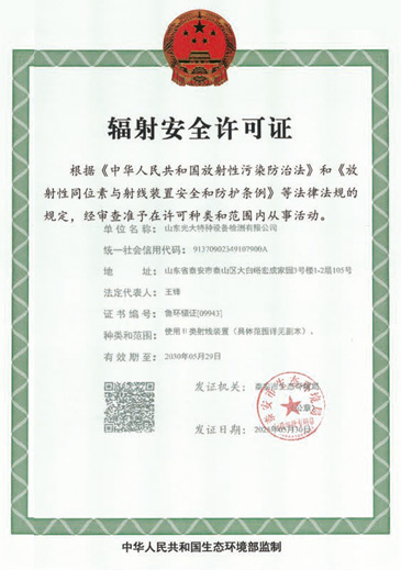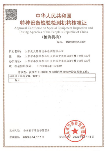 山東光大特種設備檢測有限公司是經山東省市場監(jiān)督管理局核準的甲類B1特種設備綜合檢驗機構。2017年9月30日取得了山東省市場監(jiān)督管理局頒發(fā)的《檢驗檢測機構資質認定證書》。2018年2月22日取得了山東省市場監(jiān)督管理局頒發(fā)的《特種設備檢驗檢測機構核準證》(起重機械)檢驗檢測資質。2021年11月取得山東省市場監(jiān)督管理局版發(fā)的《特種設備檢驗檢測機構核準證》(安全閥在線、離線)校驗資質。2023年11月取得山東省市場監(jiān)督管理局頒發(fā)的甲類檢驗機構B1《特種設備檢驗檢測機構核準證》,具有壓力容器(RD2...
